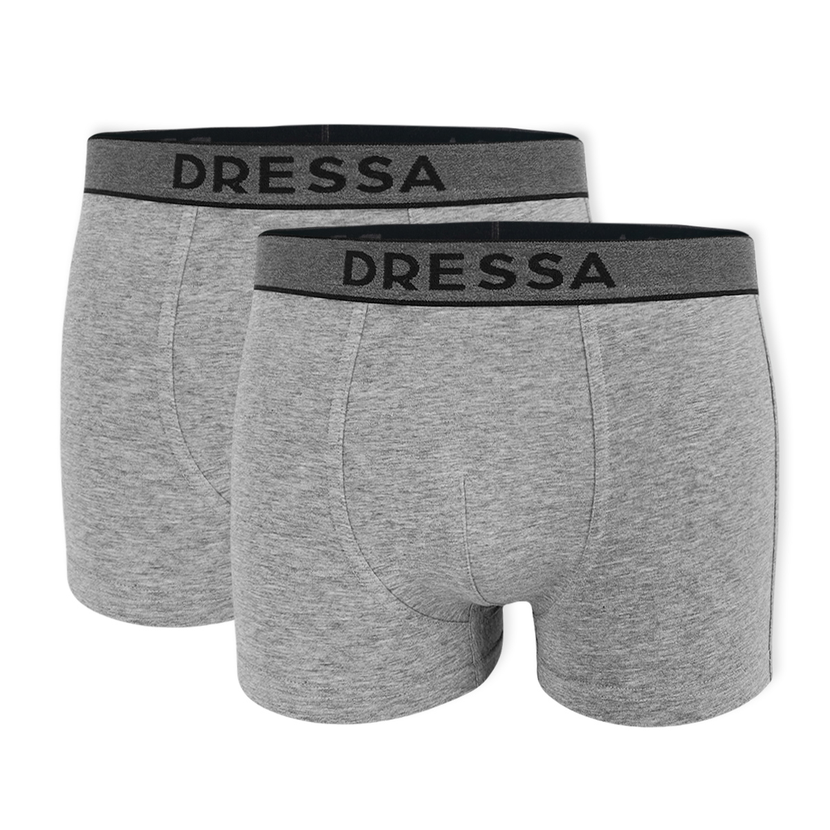 2 darabos, szürke színű Dressa pamut boxeralsó férfiaknak, divatos és rugalmas gumírozással. Összetétele: 93% pamut, 7% elasztán.