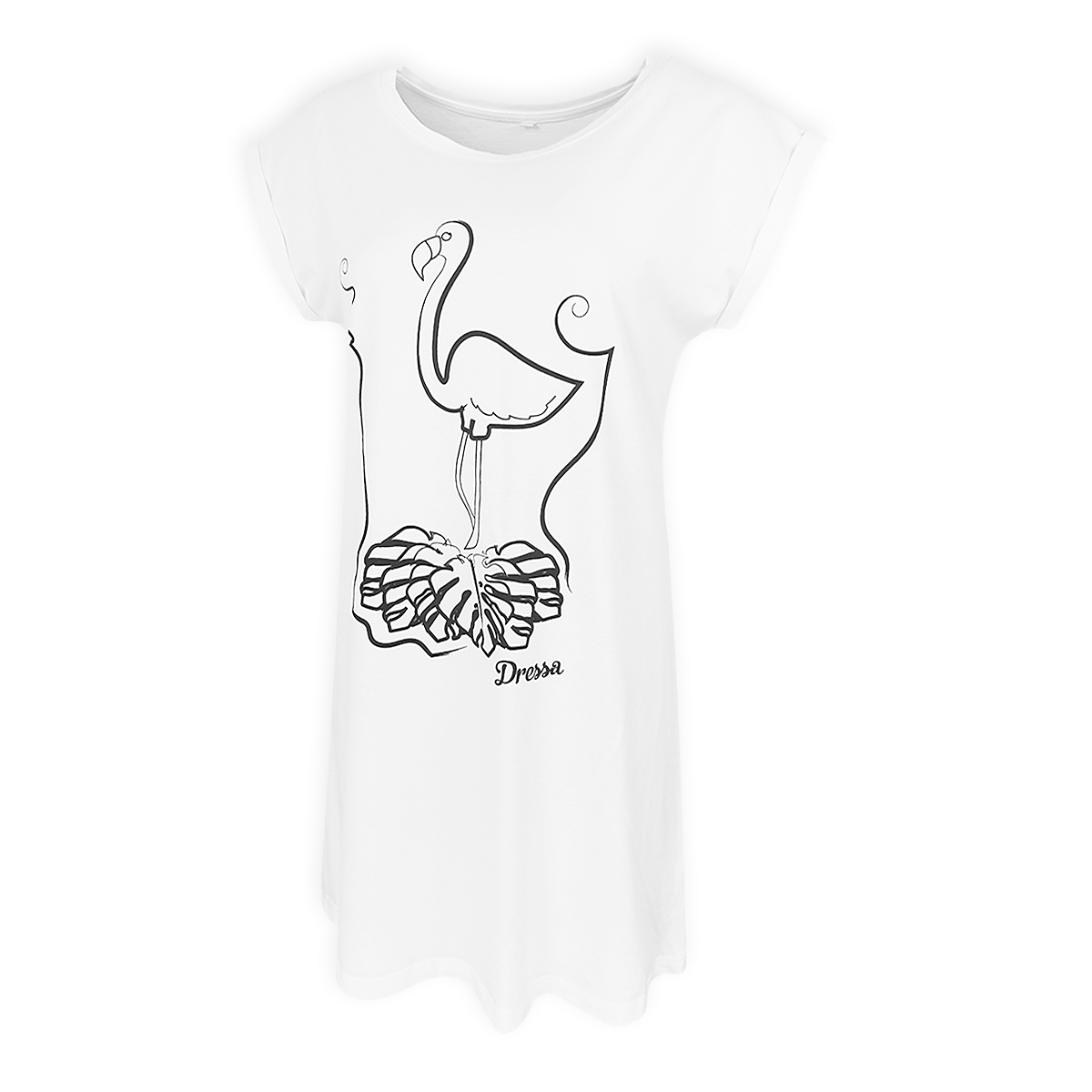 A Dressa flamingó mintás pamut pólóruha – fehér színben tökéletes viselet lehet hálószobába, vagy strandra. Komfortos szabása és könnyed, szellős anyaga maximális kényelmet ad. Elöl divatos flamingó minta van rajta, ami fiatalos megjelenést ad. Széles nyakkivágása miatt könnyen lehet belebújni, vagy kibújni belőle. Strandruhaként és hálóruhaként is viselheted.