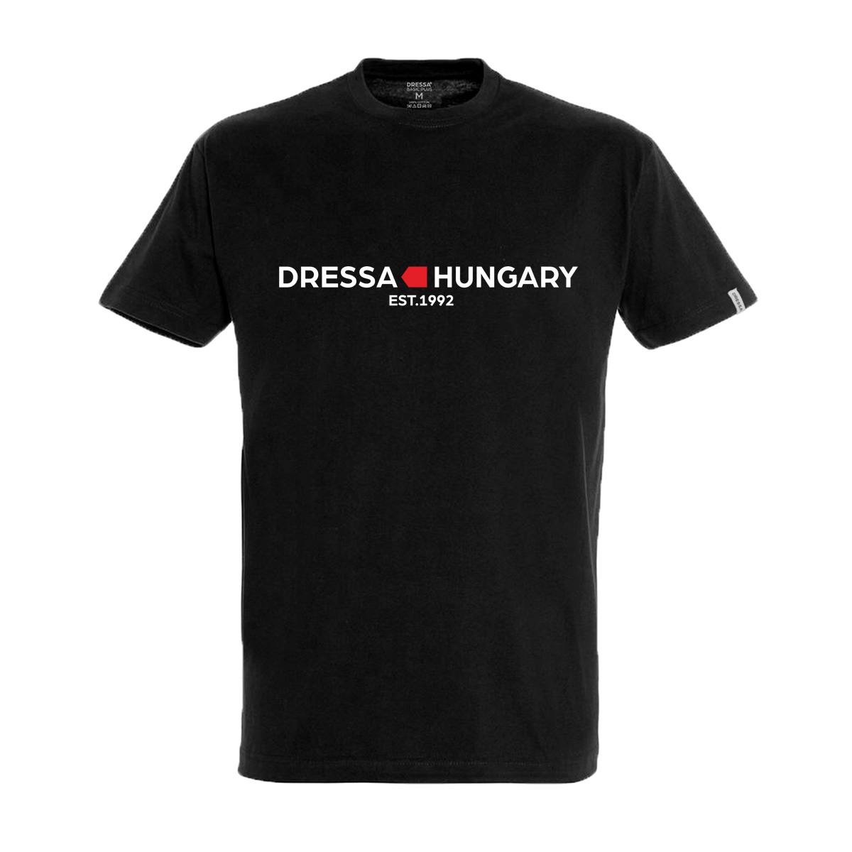 Dressa Hungary EST.1992 feliratos nagyméretű környakú rövid ujjú pamut póló – fekete