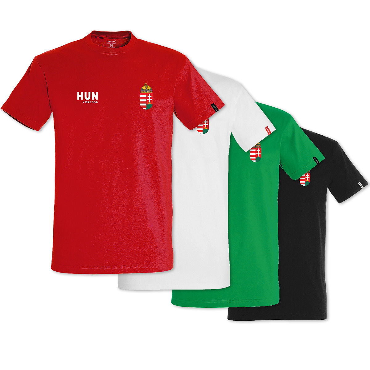 Szurkolj stílusosan a Dressa magyar címeres pamut pólóiban! A 4 darabos csomag tökéletes ajándék szurkolóknak.