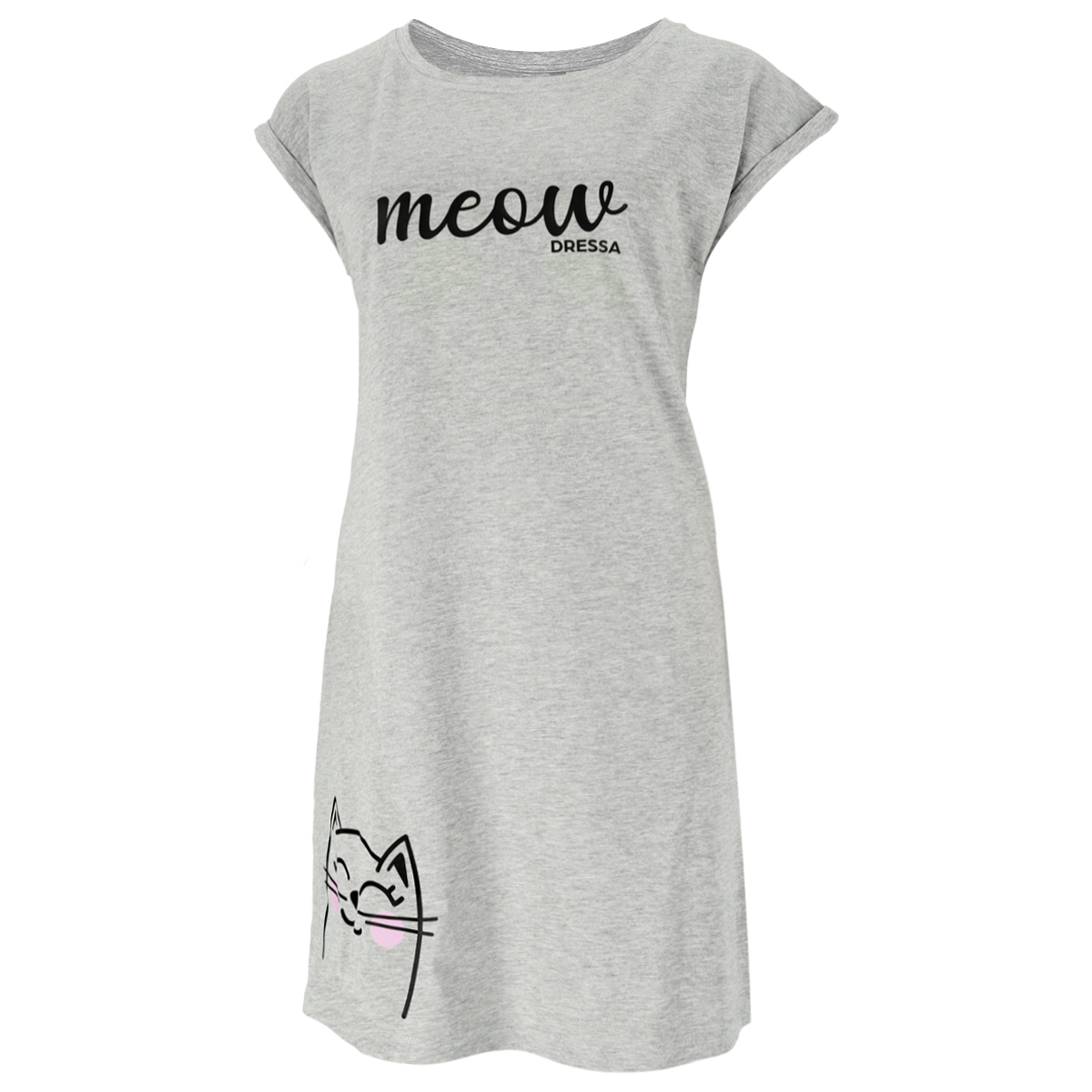 Dressa Meow feliratos cicás pamut pólóruha – melírszürke – melírszürke színben tökéletes viselet lehet hálószobába, vagy strandra. Komfortos szabása és könnyed, szellős anyaga maximális kényelmet ad. Elöl egy trendi minta van rajta, ami fiatalos megjelenést ad. Széles nyakkivágása miatt könnyen lehet belebújni, vagy kibújni belőle. Strandruhaként és hálóruhaként is viselheted.