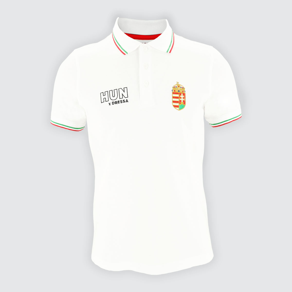A Dressa Prémium hímzett magyar címeres galléros szurkolói pamut póló – fehér színben elegáns és hazafias megjelenést kínál. Tökéletes választás szurkoláshoz sporteseményre vagy akár nemzeti ünnepre.