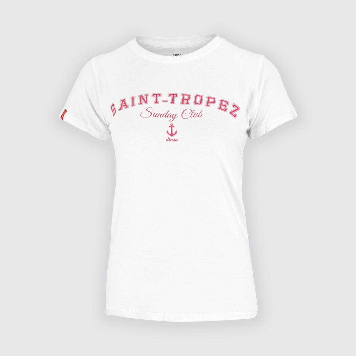 A Dressa Sunday Club feliratos női pamut póló – fehér színben a francia Riviéra hangulatát idézi ez a bájos póló. A „Sunday Club” felirat és az alatta elhelyezett horgony motívum tengerparti életérzést sugall.