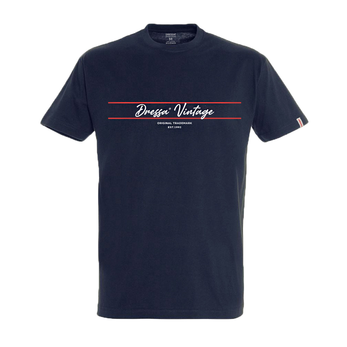 Dressa Vintage Signature feliratos környakú rövid ujjú pamut póló – sötétkék